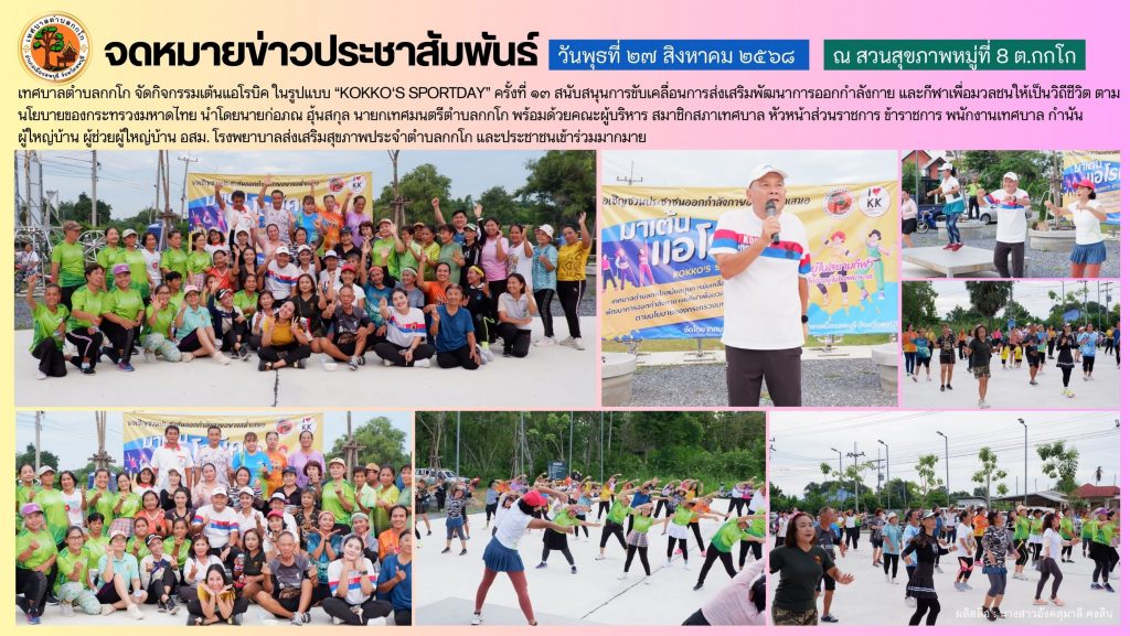เทศบาลตำบลกกโก จัดกิจกรรมเต้นแอโรบิค ในรูปแบบ “KOKKO‘S SPORTDAY” ครั้งที่ 13 สนับสนุนการขับเคลื่อนการส่งเสริมพัฒนาการออกกำลังกายฯ ตามนโยบายของกระทรวงมหาดไทย