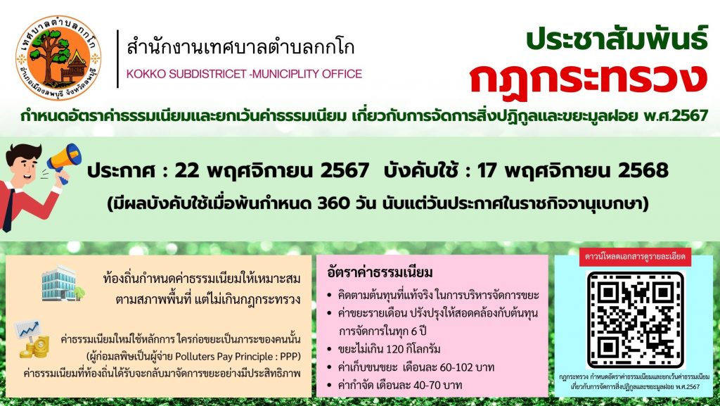 ประชาสัมพันธ์กฏกระทรวง กำหนดอัตราค่าธรรมเนียมและยกเว้นค่าธรรมเนียม เกี่ยวกับการจัดการสิ่งปฏิกูลและขยะมูลฝอย พ.ศ.2567