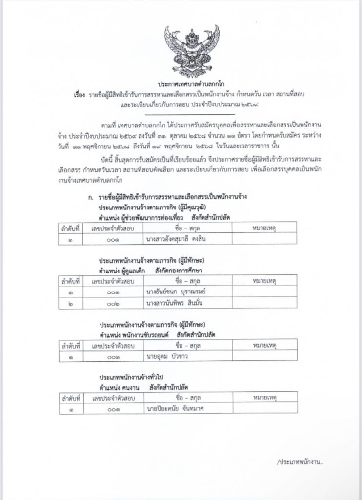 ประกาศเทศบาลตำบลกกโก รายชื่อผู้มีสิทธิเข้ารับการสรรหาและเลือกสรรเป็นพนักงานจ้าง