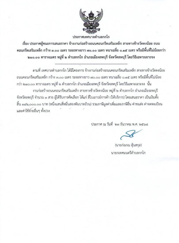 จ้างงานก่อสร้างถนนคอนกรีตเสริมเหล็ก สายทางข้างวัดดงน้อย ถนนคอนกรีตเสริมเหล็ก กว้าง 3.00 เมตร ระยะทางยาว 70.00 เมตร หนาเฉลี่ย 0.15 เมตร หรือมีพื้นที่ไม่น้อยกว่า 210.00 ตารางเมตร ม.2 ต.กกโก อ.เมืองลพบุรี จ.ลพบุรี