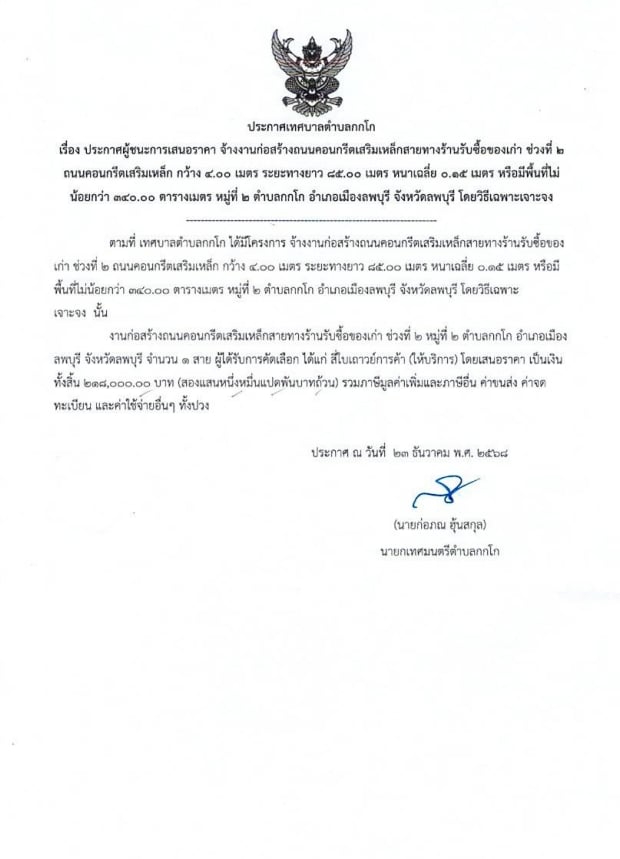 จ้างงานก่อสร้างถนนคอนกรีตเสริมเหล็กสายทางร้านรับซื้อของเก่า ช่วงที่ 2 ถนนคอนกรีตเสริมเหล็ก กว้าง 4.00 เมตร ระยะทางยาว 85.00 เมตร หนาเฉลี่ย 0.15 เมตร หรือมีพื้นที่ไม่น้อยกว่า 340.00 ตารางเมตร ม.2 ต.กกโก อ.เมืองลพบุรี จ.ลพบุรี