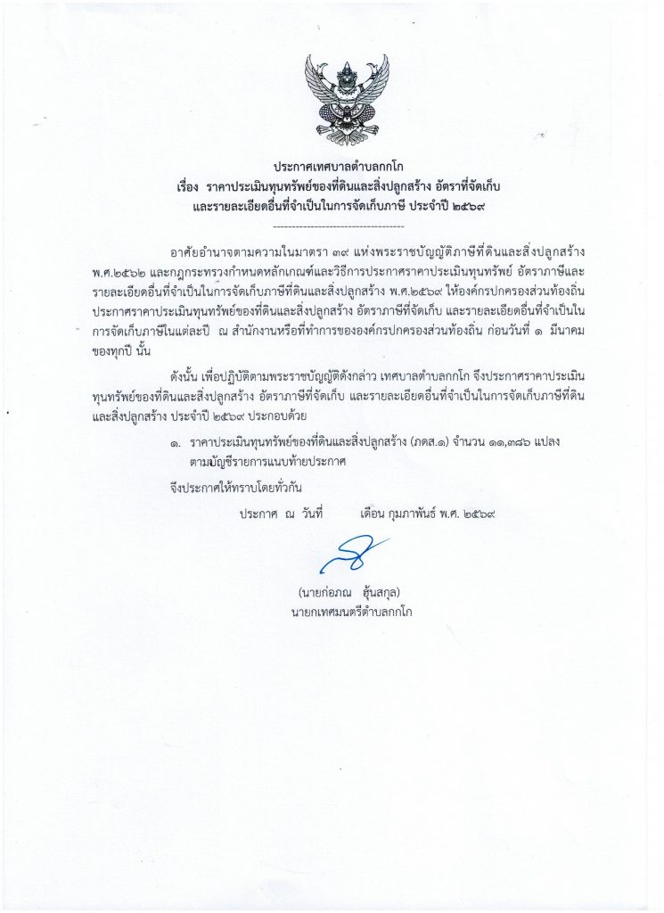 ราคาประเมินทุนทรัพย์ของที่ดินและสิ่งปลูกสร้างอัตราที่จัดเก็บและรายละเอียดอื่นที่จำเป็นในการจัดเก็บภาษี ประจำปี 2568