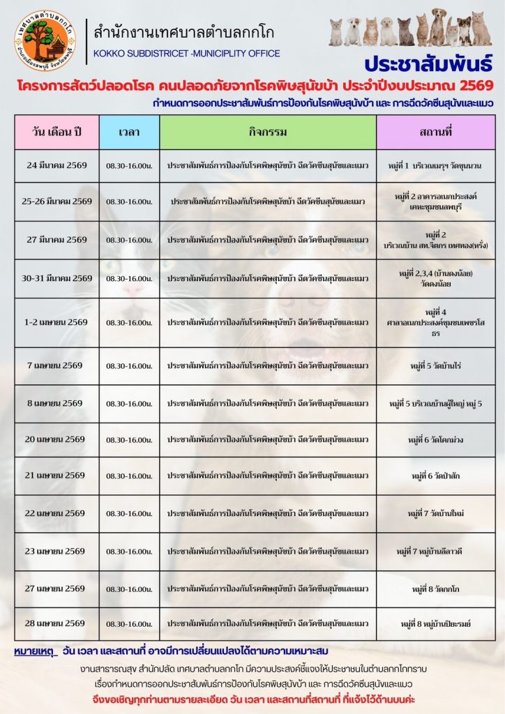 ประชาสัมพันธ์จากเทศบาลกกโก เรื่องการตั้งจุดบริการฉีดวัคซีนพิษสุนัขบ้าให้กับสุนัขและแมว