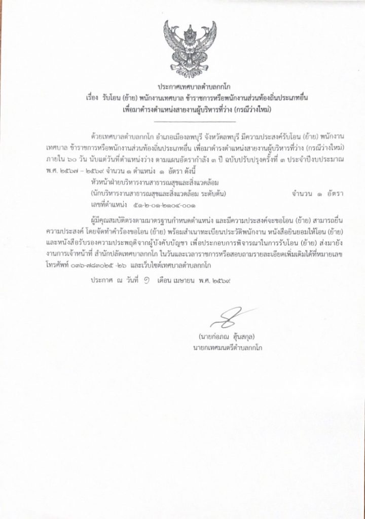 ประกาศเทศบาลตำบลกกโก รับโอน (ย้าย) พนักงานเทศบาลข้าราชการหรือพนักงานส่วนท้องถิ่นเพื่อมาดำรงตำแหน่งสายงานผู้บริหารที่ว่าง