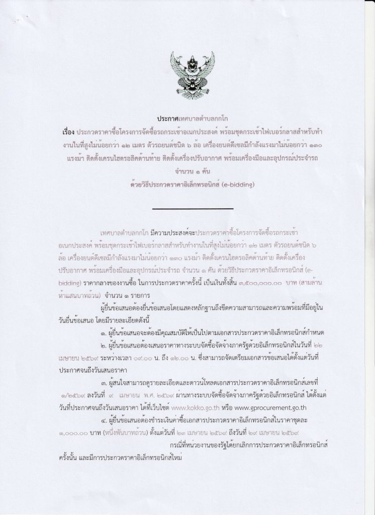 ดาวน์โหลดเอกสาร ประกาศ ประกวดราคาซื้อโครงการจัดซื้อรถกระเช้าอเนกประสงค์ พร้อมชุดกระเช้าไฟเบอร์กลาสสำหรับทำงานในที่สูงไม่น้อยกว่า 12 เมตร ตัวรถยนต์ชนิด 6 ล้อ เครื่องยนต์ดีเซลมีกำลังแรงม้าไม่น้อยกว่า 130 แรงม้า ติดตั้งเครนไฮดรอลิคด้านท้าย ติดตั้้งเครื่องปรับอากาศ พร้อมเครื่องมือและอุปกรณ์ประจำรถ จำนวน 1 คัน