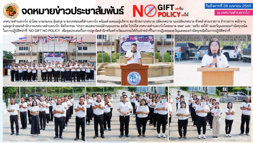 กิจกรรม “ประกาศเจตนารมณ์ด้านคุณธรรม สุจริต โปร่งใส เทศบาลตำบลกกโกใสสะอาด 2569” และ “งดรับ งดให้” ของขวัญและของกำนัลทุกชนิดในการปฏิบัติหน้าที่ ❌ NO GIFT NO POLICY ❌