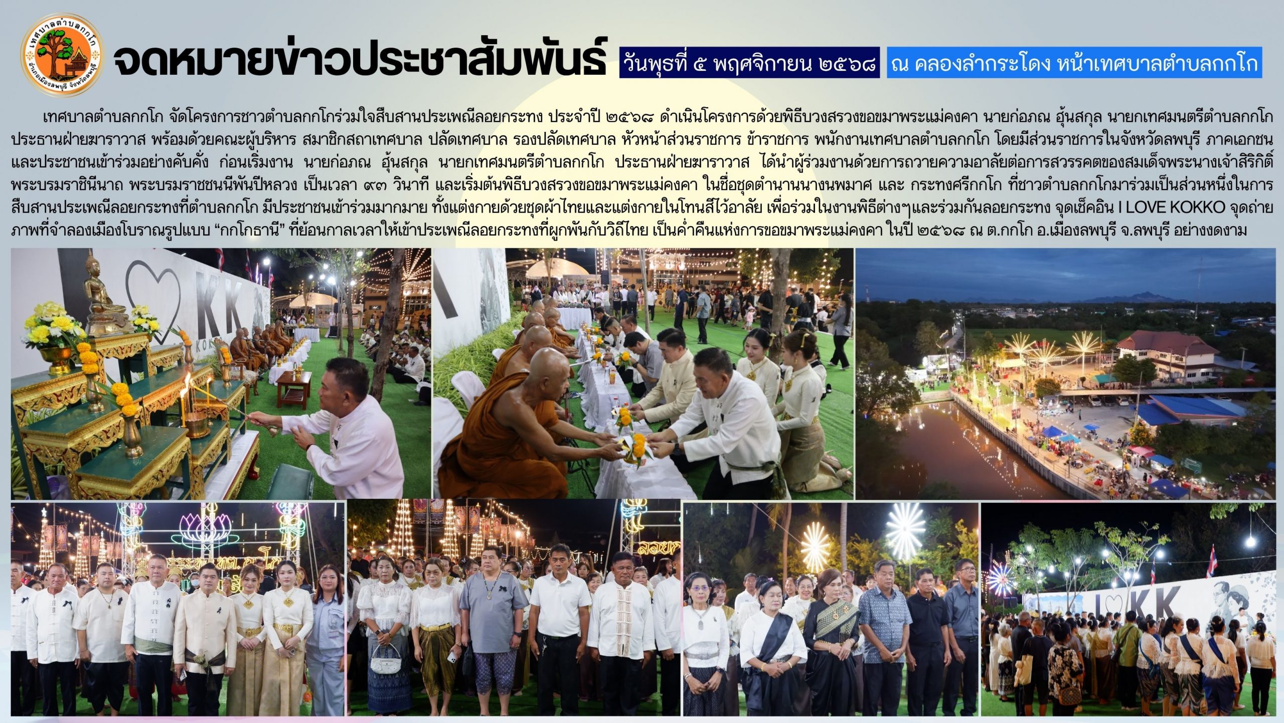 เทศบาลกกโกสืบสานงานประเพณีลอยกระทงที่กกโก ณ ท่าน้ำคลองลำกระโดง หน้าเทศบาลตำบลกกโก วันพุธที่ ๕ พฤศจิกายน ๒๕๖๘